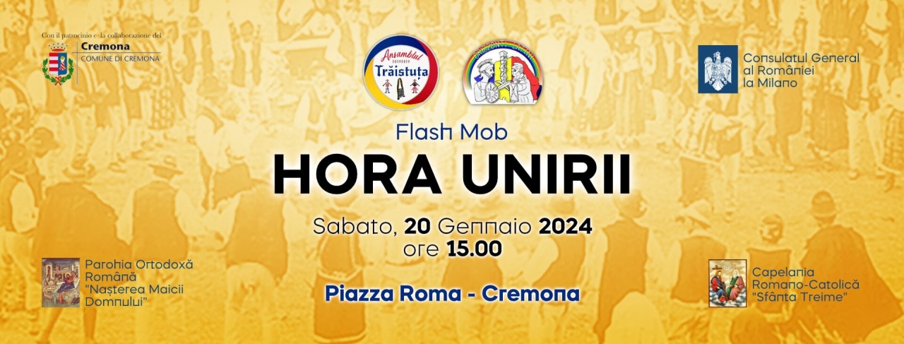 Festeggiamo con il popolo romeno e vi incontriamo a Piața Sfatului (Piazza Roma - Cremona) come fecero i nostri antenati il 24 gennaio 1859, quando sotto il governo di Cuza Vodă ebbe luogo l'Unione della Tăra Românească e della Moldavia.